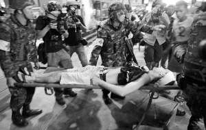 | 4月22日,在泰国首都曼谷是隆路,泰国军人正在用担架转移一名在爆炸中受伤的男子。 新华社/路透 |