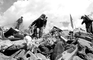 4月24日,来自四川内江陆军预备役防化团的官兵在废墟上消毒。目前,玉树灾区的卫生防疫队累计完成消杀灭面积103万平方米,消毒帐篷6600顶,完成水质监测40个点。新华社记者 普布扎西 摄