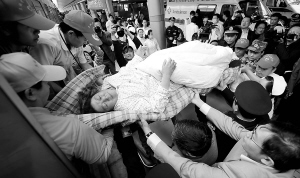 4月24日,一名地震伤员在兰州火车站被抬下列车。  新华社记者 聂建江 摄
