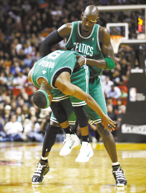 | 24日,在NBA季后赛中,凯尔特人队以100:98战胜热火队。图为凯尔特人队球员加内特(后)当队友隆多摔倒时将其扶住。 新华社发 |