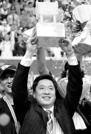 | 4月25日,广东队主教练李春江在颁奖仪式上高举冠军鼎。 新华社发 |
