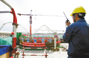 | 四月二十五日上午,昌江核电工程开工仪式现场,工人们在加紧施工。 本报记者 张杰 摄