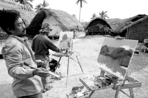 | 4月22日,四位广东、福建籍画家到东方市江边乡俄查村黎家草屋群进行绘画艺术创作。 本报记者 苏晓杰 摄 |
