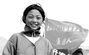 玉树地震灾区结古镇的藏族姑娘拉毛站在自家帐篷附近的一处医疗救治点旁。