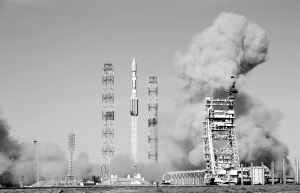 4月24日,俄罗斯航天兵新闻发言人佐洛图欣宣布,俄罗斯当天下午从哈萨克斯坦境内的拜科努尔发射场用一枚“质子-M”运载火箭成功发射一颗名为SES-1的美国通信卫星。 新华社/法新