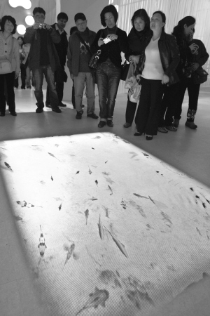 | 游客刚一入海南馆就被地上会游动的热带鱼所吸引。 本报特派记者 王凯 摄 |