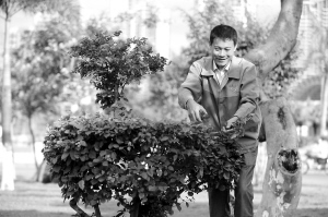 | 董辉在三亚鹿回头广场细心地给花木修枝。 本报记者 苏建强 摄 |