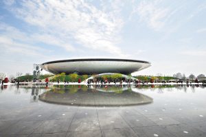 4月25日,世博园世博文化中心“水镜”倒映,引人注目。 近日,上海世博会景观水景———庆典广场“水镜”开始试运行。据介绍,“水镜”可以反射“一轴四馆”建筑,还会产生喷雾效果,成为世博园区主要的景观水景,受到游客青睐。 新华社发