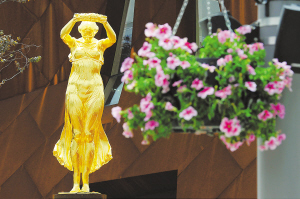 这是卢森堡馆外的“金色少女像”(4月27日摄)。“金色少女像”“诞生”于1923年,作为珍贵的文化遗产,被视为卢森堡“国宝”。 新华社记者 陈晓伟 摄