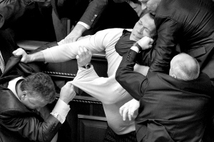 在当天的乌克兰议会辩论中,执政联盟和反对党一度僵持不下,两派议员发生扭打,甚至出现投掷鸡蛋乃至烟雾弹的场面。