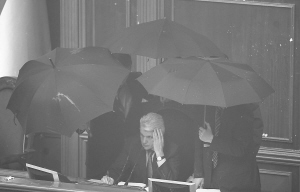 法新社报道,乌克兰议会议长弗拉基米尔·利特温首先遭鸡蛋袭击。利特温不得不撑伞暂避。