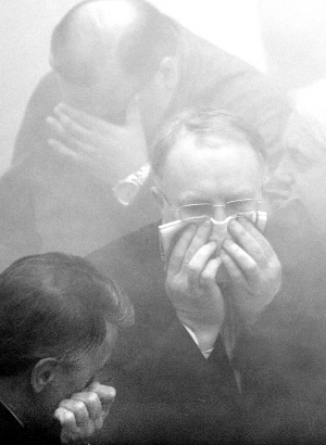 冲突中,一枚来源不明的烟雾弹突然扔入议会大厅。一时烟雾弥漫,议员手捂口鼻,警报响起。