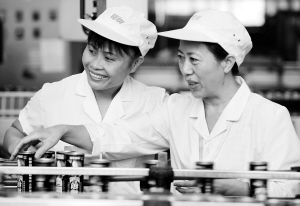 | 覃碧霞(右一),在椰树椰汁生产线上与女工交流产品质量等问题。 本报记者 苏晓杰 摄 |