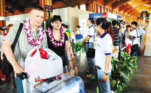 | 4月25日,凤凰机场,境外游客喜飞三亚。 本报记者 苏建强 摄 |