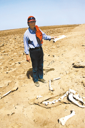 在罗布泊盐碱地中发现野骆驼尸骨。4月13日至4月23日,由科研人员、探险人士、民间志愿者和媒体记者组成的黑豹科考探险队在甘肃敦煌和新疆罗布泊地区进行科考探险活动。 新华社发