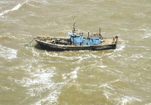 图为烟台海阳海面上,一艘失去动力的渔船被困。 新华社发