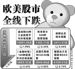 到纽约股市收盘时,道琼斯30种工业股票平均价格指数比前一个交易日跌213.04点,收于10991.99点,跌幅为1.90%。标准普尔500种股票指数跌28.34点,收于1183.71点,跌幅为2.34%。纳斯达克综合指数跌51.48点,收于2471.47点,跌幅为2.04%。