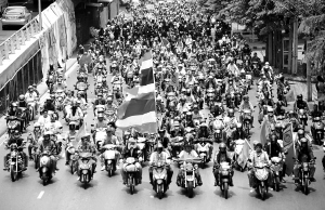 ↑4月28日,泰国首都曼谷街头,“红衫军”高举国旗示威。新华社/路透