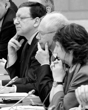 4月28日,在日本东京的首相官邸,欧盟委员会主席巴罗佐(右三)、欧洲理事会主席范龙佩(右二)等出席日本-欧盟定期首脑峰会。双方同意进一步加强伙伴关系,并在解决伊朗核问题方面加强合作。 新华社发