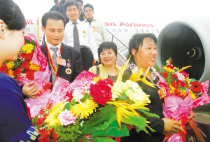4月28日,参加2010年全国劳动模范和先进工作者表彰大会的我省45位全国劳模和先进工作者及4位特邀代表载誉归来。 本报记者 张杰 摄