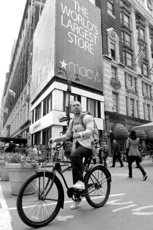 4月28日,一位市民在美国纽约曼哈顿的街道上骑自行车。 近日,美国纽约一个倡导骑自行车和搭乘公共交通出行组织的一项报告显示,2009年纽约每天骑自行车出行的市民数量达到23.6万人,比上一年增加了28%,这已是连续第4年增长。 新华社发(吴凯翔摄)