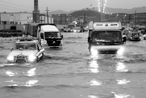 4月28日,汽车在也门首都萨那被洪水淹没的街道上行驶。 据当地媒体报道,近一周来由暴雨引发的洪水已导致也门至少9人死亡。新华社/路透