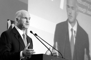 4月28日,希腊总理帕潘德里欧在《经济学人》杂志举办的一次研讨会上发表演讲。 帕潘德里欧当日呼吁进行全球金融监督管理,以应对已从希腊蔓延到欧元区其他成员国的严重经济危机。 新华社/法新