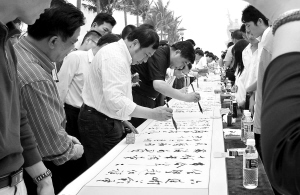 本报讯 (记者卓兰花 特约记者陈朝辉)4月28日上午,临高县临高角解放海南纪念园风和日丽,人潮涌动。代表我省书法工作者前来临高角参加“笔歌海南”大型书法活动的60名书法家,在长达60米的长卷上恣意挥毫,书写名篇警句,以此纪念海南解放60周年,缅怀革命先烈。