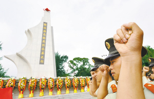 | 4月29日,武警海南边防总队海警一支队的35名战士在“解放海南的英烈永垂不朽”纪念碑前举行新团员入团宣誓仪式。 本报记者 宋国强 摄 |