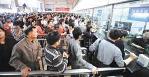 | 长沙火车站迎“五一”客流高峰,旅客在长沙火车站售票大厅排队购票(4月30日摄)。