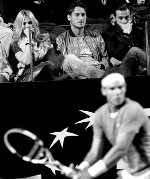 | 4月29日,在ATP罗马大师赛现场,意大利球星托蒂(上中)与妻子观看西班牙选手纳达尔与罗马尼亚选手哈内斯库的比赛。纳达尔2:0获胜,晋级八强。 新华社发 |