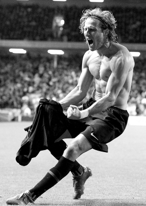 | 北京时间4月30日,在欧罗巴联赛半决赛次回合比赛中,马德里竞技队客场以1比2不敌利物浦队,双方总比分战成2比2,但马竞仍以客场进球优势晋级决赛。图为马竞球员弗兰庆祝进球。 新华社发 |