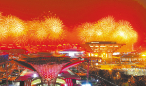 | 4月30日,中国2010年上海世博会开幕式大型灯光喷泉焰火表演在上海举行。 新华社记者 程敏 摄 |