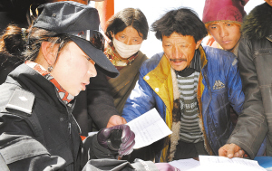 4月30日,民警在登记流动人口信息。自4月25日以来,已完成登记流动人口6000多人。据介绍,经进一步核实确认以后,他们将享受与常住人口同样的救助政策。 新华社发