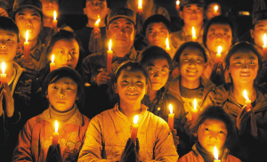 4月30日晚,玉树孤儿学校师生与邱少云生前部队官兵一起点燃象征希望的红蜡烛。 当晚,上海世博会开幕,玉树孤儿学校师生与邱少云生前所在部队官兵一起观看开幕式,并举行“我在长江源,世博在长江尾”主题班会活动,为全国人民和上海世博会祈福。 新华社记者 陶明 摄
