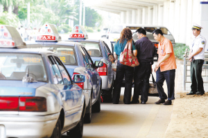 | 5月1日,美兰机场出租车秩序较好,几位刚下飞机的乘客在出港处搭乘出租车。