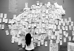 5月1日是海南解放60周年纪念日,4000多名市民和游客前往海南解放60周年图片展展馆参观。这是市民参观后在展馆留言。 本报记者 王军 摄