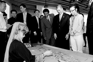 5月1日,海南馆就引来了塞舌尔共和国总统米歇尔(右二)前来参观。 本报特派记者王凯摄