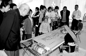 | 5月1日,随着上海世博会的正式开园,位于中国馆一楼的海南馆也正式开馆。来自各地的游客纷纷到这里感受海南的风情与魅力。图为游客现场感受苗族织绣技艺。 本报特派记者 王凯 摄 |