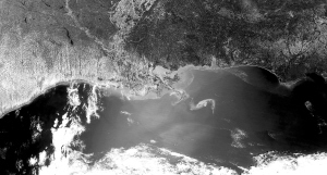 | 这张4月30日的卫星照片显示,墨西哥湾石油钻井平台爆炸后泄漏的原油漂浮到美国路易斯安那州海岸。 新华社/路透 |