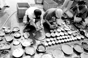5月1日,考古人员正在清理打捞出来的文物。 自4月上旬重启明代沉船“南澳Ⅰ号”文物抢救性发掘工作以来,“南澳Ⅰ号”水下考古队在沉船表面及外围采集到散落的完整或可复原文物共800余件,出水文物包括青花瓷大盘、碗、钵、杯、罐、瓶等,此外还有釉陶瓷、铁锅、铜钱及铜板等。 新华社发