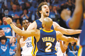 | 北京时间5月1日,湖人队客场以95:94险胜雷霆队,以4:2的总比分晋级西部半决赛。图为湖人球员加索尔(上)攻入制胜一球后与队友费舍尔庆祝。