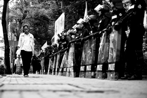 5月3日,在泰国曼谷,一名妇女从警察队伍前走过。 当日,泰国总理阿披实说,他准备提出一份政治路线图以化解首都曼谷困局。他宣布,政府向“红衫军”示威者发出预警后,会采取行动,促使他们离开曼谷商业区集会地。 新华社记者 吕小炜 摄