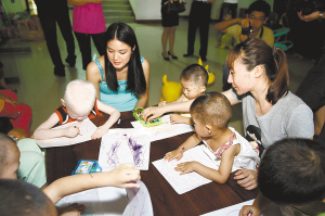 →桑雪(右)、吴英娜(左)到三亚儿童福利院看望孤残儿童。特约记者 孙清 摄