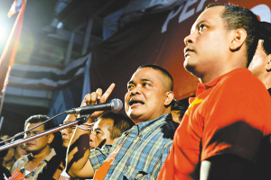 | 4日,在泰国首都曼谷,“红衫军”领导人之一乍都蓬(右二)在发表讲话,宣布接受总理阿披实提出的和解路线图。 新华社发 |