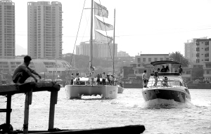 上图:5月5日,一批批游客乘坐游艇、帆船缓缓驶出三亚港,畅游三亚湾,或者到东岛、西岛海域垂钓。 本报记者 苏建强 摄