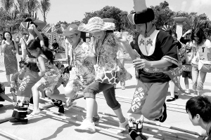 五一小长假已过,但游客来三亚旅游的热情丝毫未减。 左图:5月5日,游客们在亚龙湾热带天堂森林公园跳起打柴舞。 通讯员 黄庆优 摄