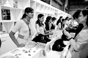 上海世博会上除看演出、品美食还可以购买到各地不同风情的小商品,在各个国家的馆区里都会有一块地方展销各自的特色商品,从服装到首饰,从食品到钟表,品种繁多。图为斯里兰卡妇女正在销售本地产品。 本报特派记者 王凯 摄