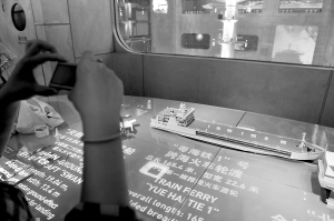 上海世博会 2 0 1 0 世博船舶馆 展示“粤海铁一号” 上海世博会上的中国船舶馆里,总长165.4米,宽22.6米的“粤海铁1号”跨海火车轮渡被作为中国第一艘跨海火车轮渡展示给各国游客。 本报特派记者 王凯 摄
