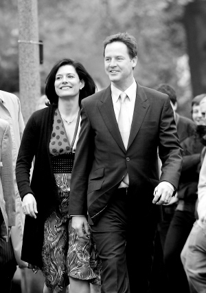| 5月6日,英国第三大党自由民主党领导人克莱格与夫人米丽娅姆来到投票站参加投票。 新华社记者 曾毅 摄 |